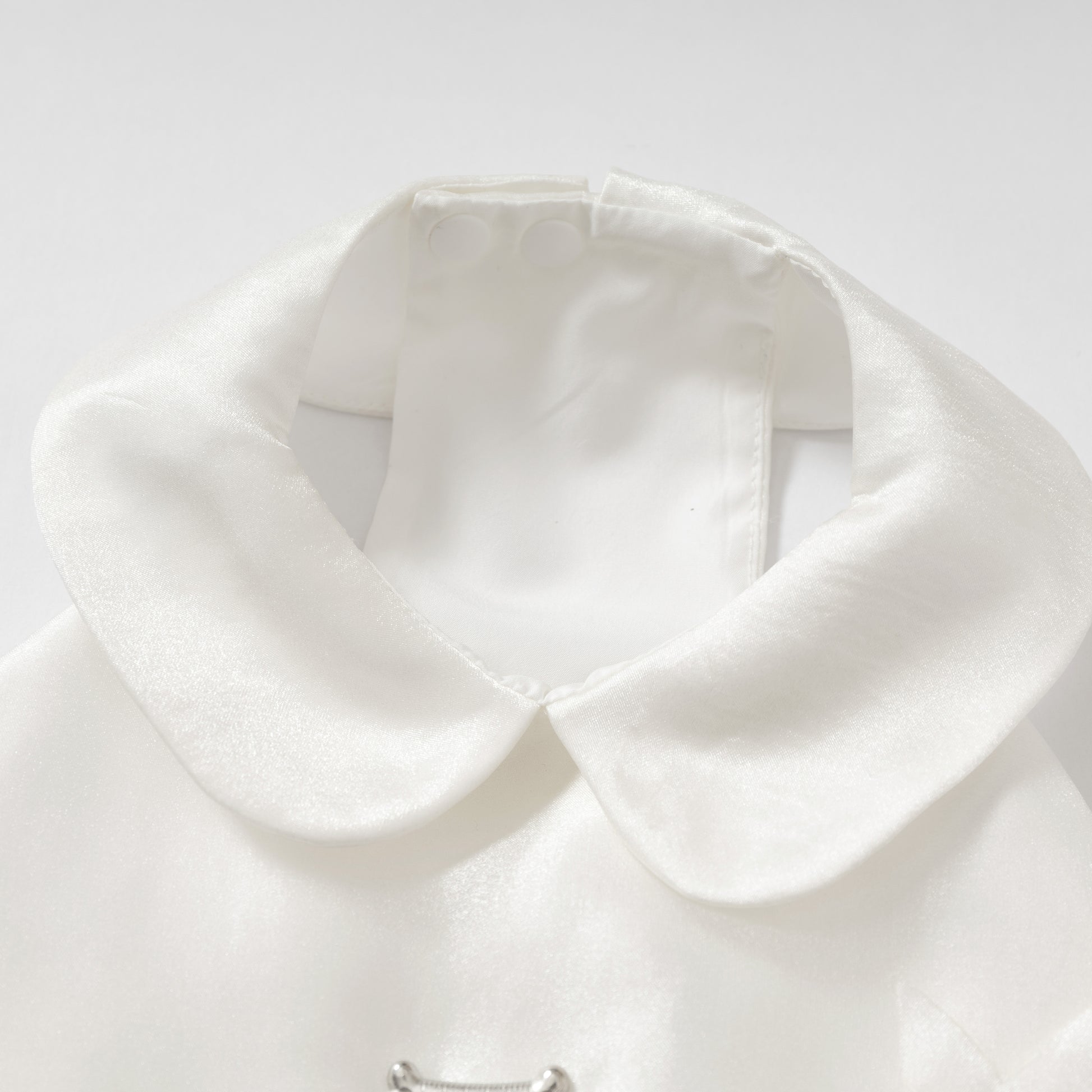 This sleeveless dog dress features a convenient snap-button closure and a charming doll collar.